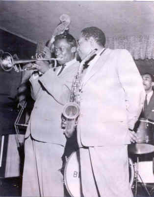 Picture of Miles Davis and Charlie Parker from the Richard Thomas Collection. They performed together at the El-Sino in 1947 ("Before Motown", p 97), but it is unknown where this particular picture was taken. |
